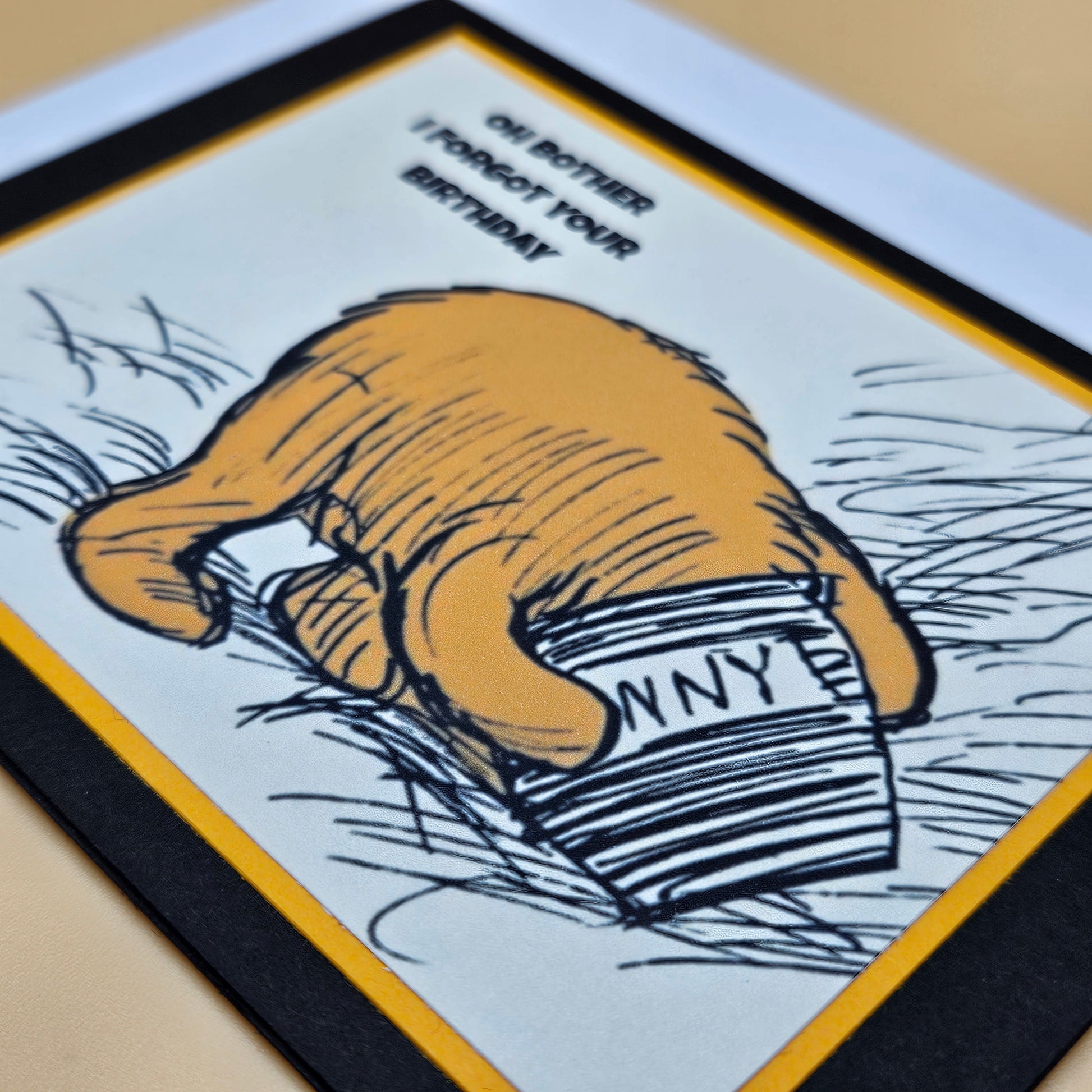 Oops. Pooh did it again — face-first in the Hunny jar and totally forgot the big day. This handmade belated birthday card blends childhood charm with a humorous twist, perfect for sending a sheepish but sweet apology. Featuring the classic Winnie the Pooh illustration and bold "Oh Bother, I Forgot Your Birthday" text, it’s a playful way to say “I’m late... but you’re still loved.”