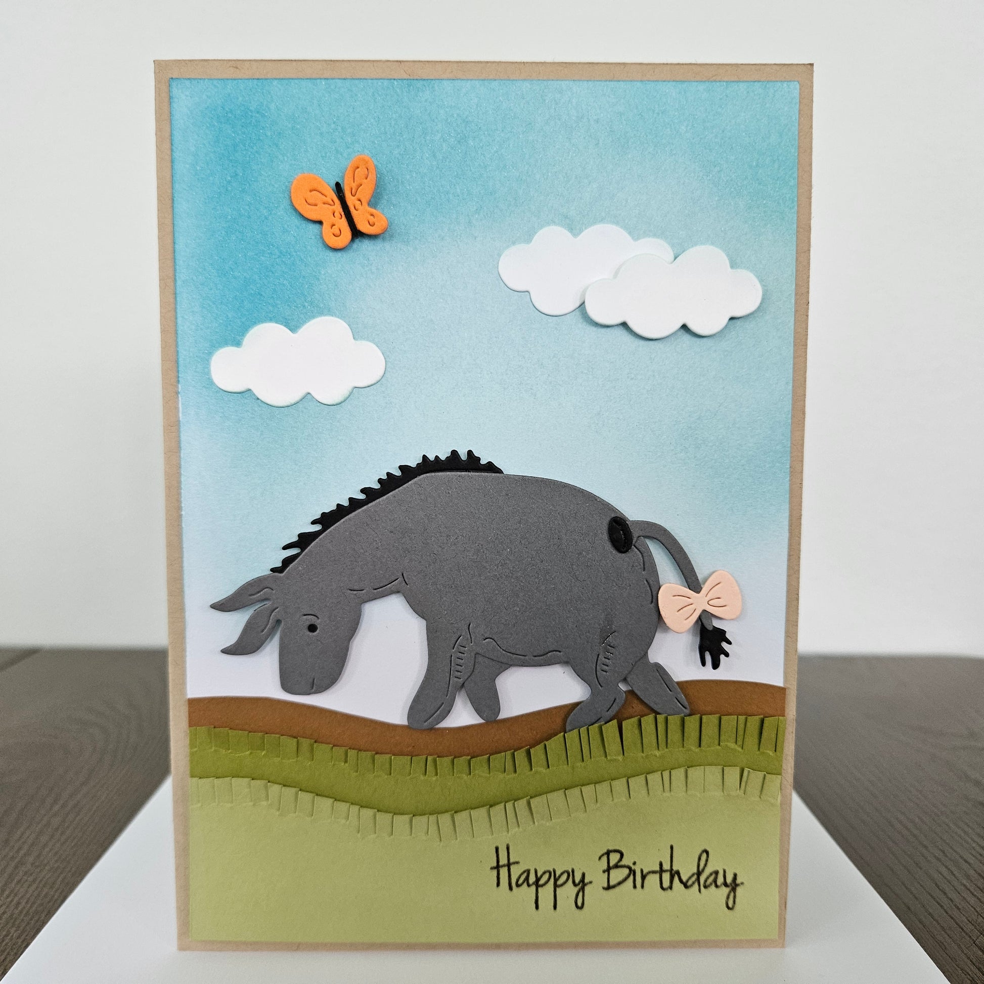 Some birthdays call for quiet smiles and tender hearts—and this handmade card delivers both. Featuring a 3D die-cut donkey inspired by the beloved Eeyore, the design captures gentle whimsy with soft layers of textured hills, floating clouds, and a cheerful butterfly in the sky. Inside, a heartfelt message speaks to memories, joy, and dreams, making this card perfect for someone who appreciates the softer, sweeter side of life.