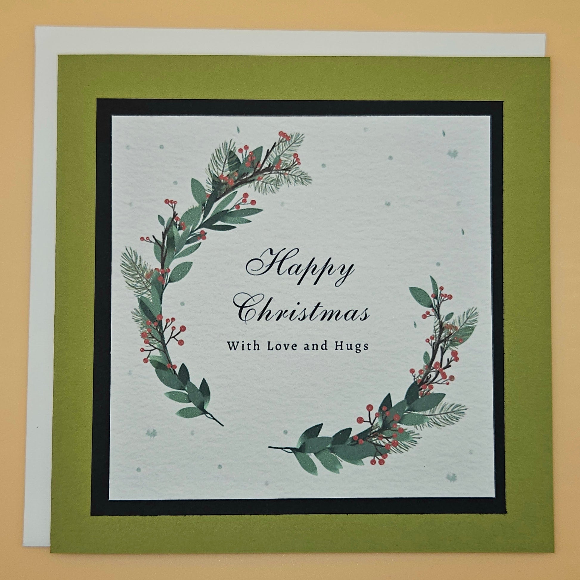 Happy Christmas With Love and Hugs (Lime Green Card): Features a partial wreath with a sweet, affectionate holiday sentiment.