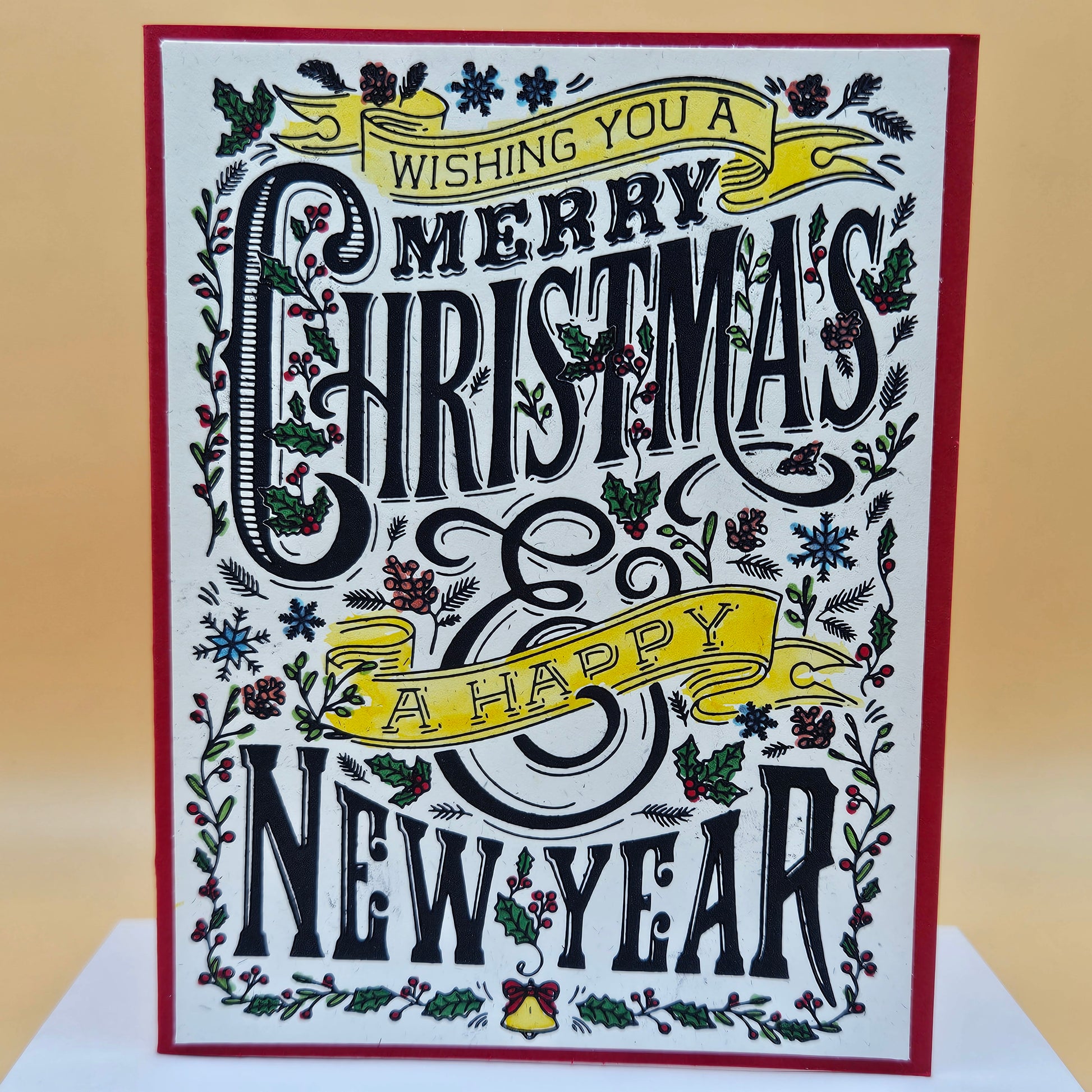 Celebrate the season in classic style with this handmade Christmas & New Year card. The intricate vintage-inspired design bursts with holly, berries, and a bold “Merry Christmas & A Happy New Year” message, perfect for spreading warmth and cheer to family, friends, or coworkers.
