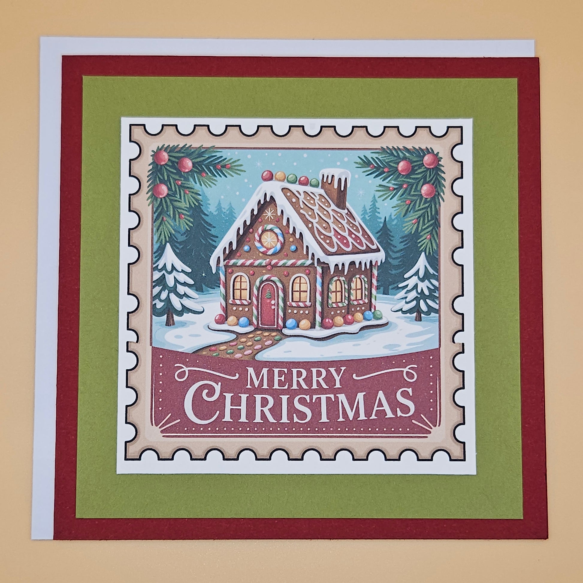Send sweet holiday wishes with this handmade Christmas card featuring a charming vintage stamp design of a gingerbread house. Perfect for cookie bakers, Christmas décor lovers, and those who adore classic holiday charm.