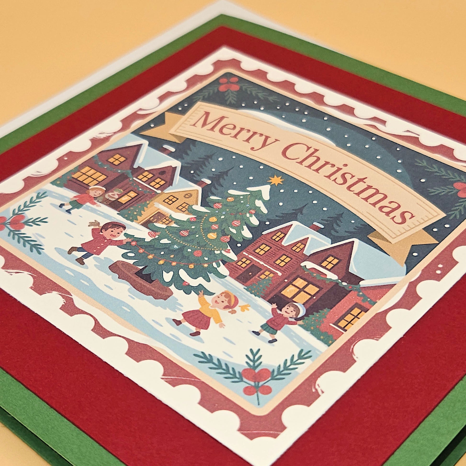 Capture the warmth of the holidays with this handmade Christmas card featuring a nostalgic village scene and festive tree. A beautiful vintage stamp design that spreads small-town Christmas cheer with every note.