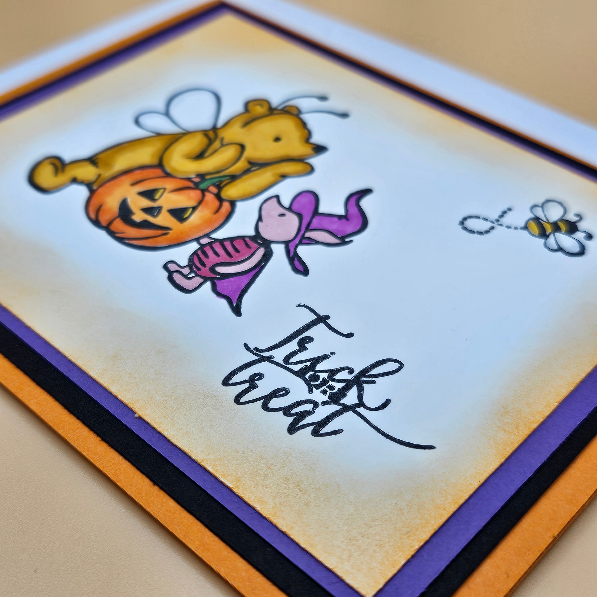 Celebrate Halloween with a dose of childhood charm! This handmade card features Winnie the Pooh dressed as a bee and Piglet in a witch costume, both gathered around a carved pumpkin ready for trick-or-treating. With rich autumn colors, layered cardstock, and adorable stamped details, it's perfect for Disney lovers, kids, or anyone who still believes in a little Halloween magic.