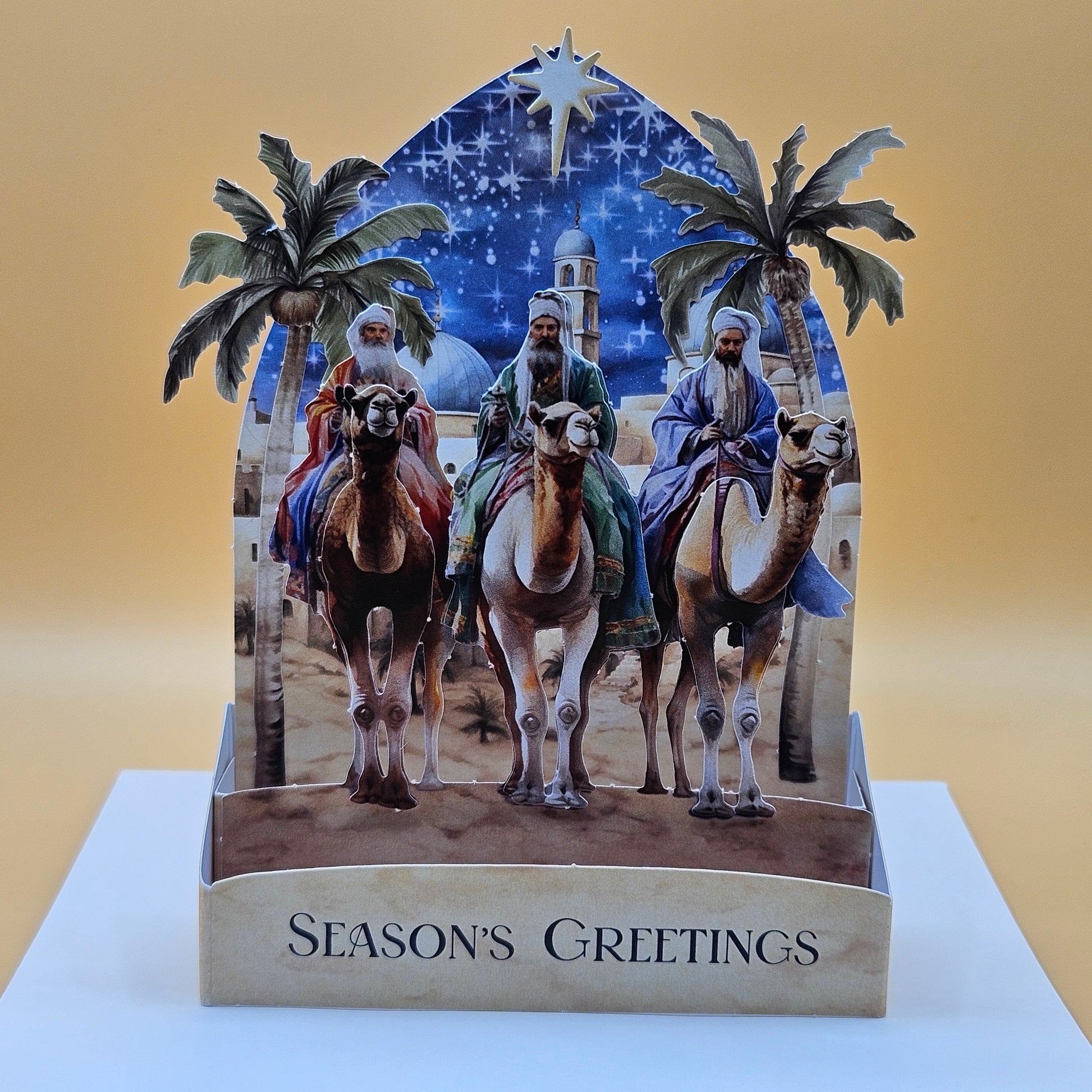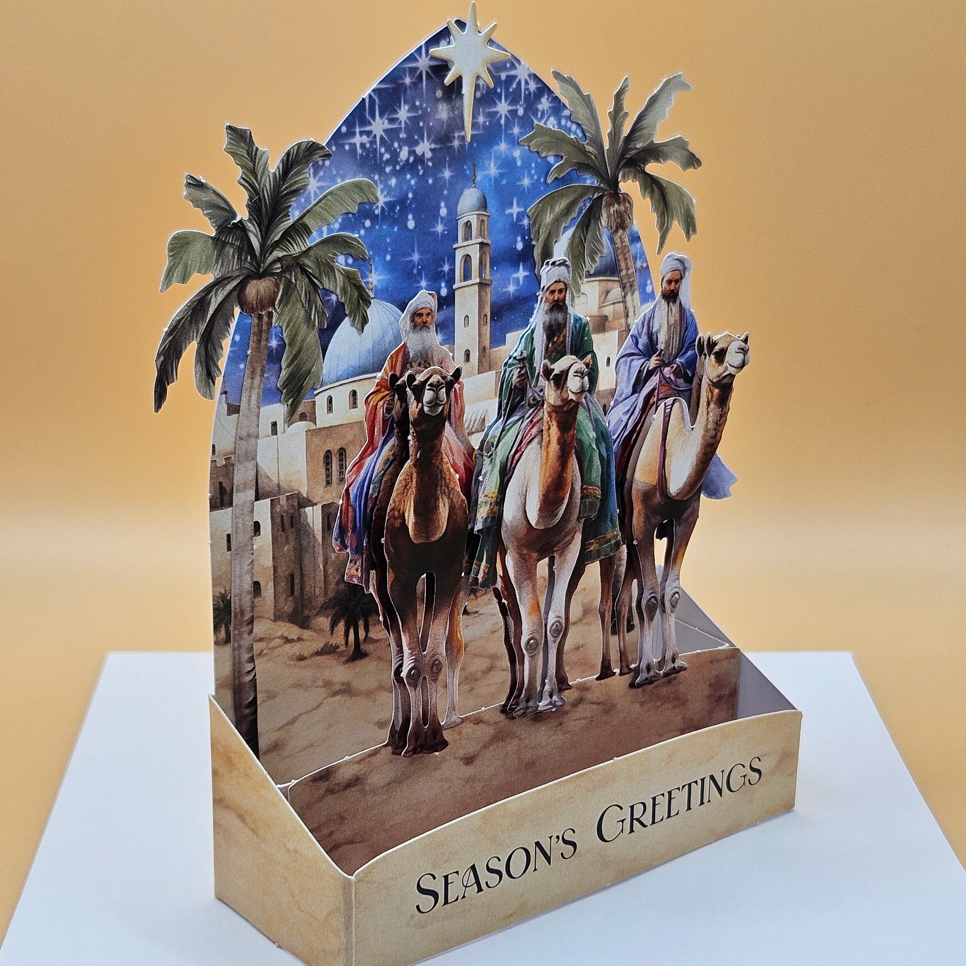 This intricate pop-up card showcases the Three Wise Men traveling under a starry sky, complete with palm trees and a glowing star. Beautifully detailed and sure to impress, it’s the perfect way to share the wonder of the season with family and friends.