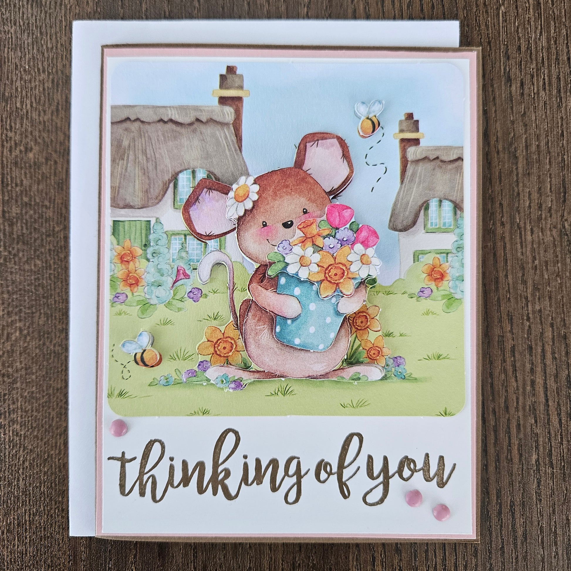 Brighten someone's day with this adorable handmade decoupage "Thinking of You" card featuring a charming mouse holding a bouquet of flowers. The layered decoupage design adds delightful depth and dimension, making this card a heartfelt keepsake. Perfect for sending warm thoughts, encouragement, or a simple "just because" message to a friend, loved one, or family member.