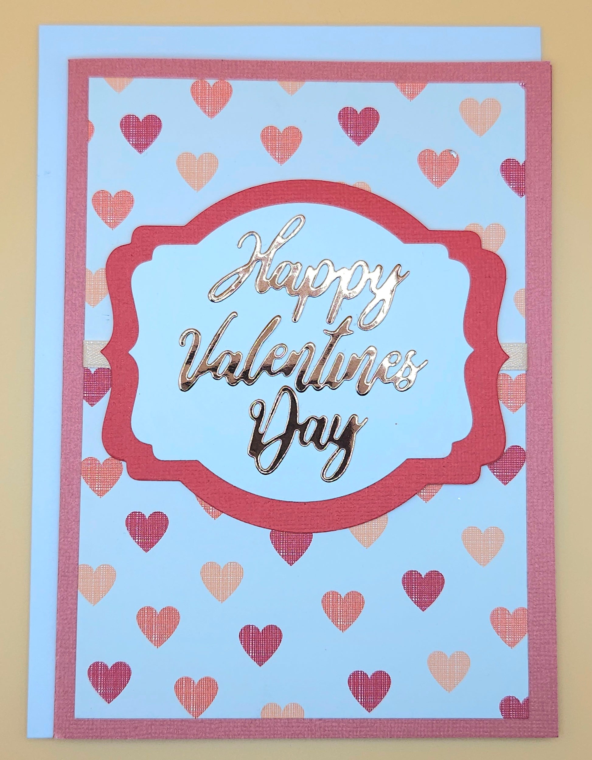 Handmade Valentine's Day Card featuring a sophisticated white background accented with a pattern of delicate red and white hearts. This elegant 5x7 design showcases a bold gold foil "Happy Valentine's Day" sentiment banner and a stunning layered focal point with a large white die-cut heart and a shimmering red glitter heart accent.