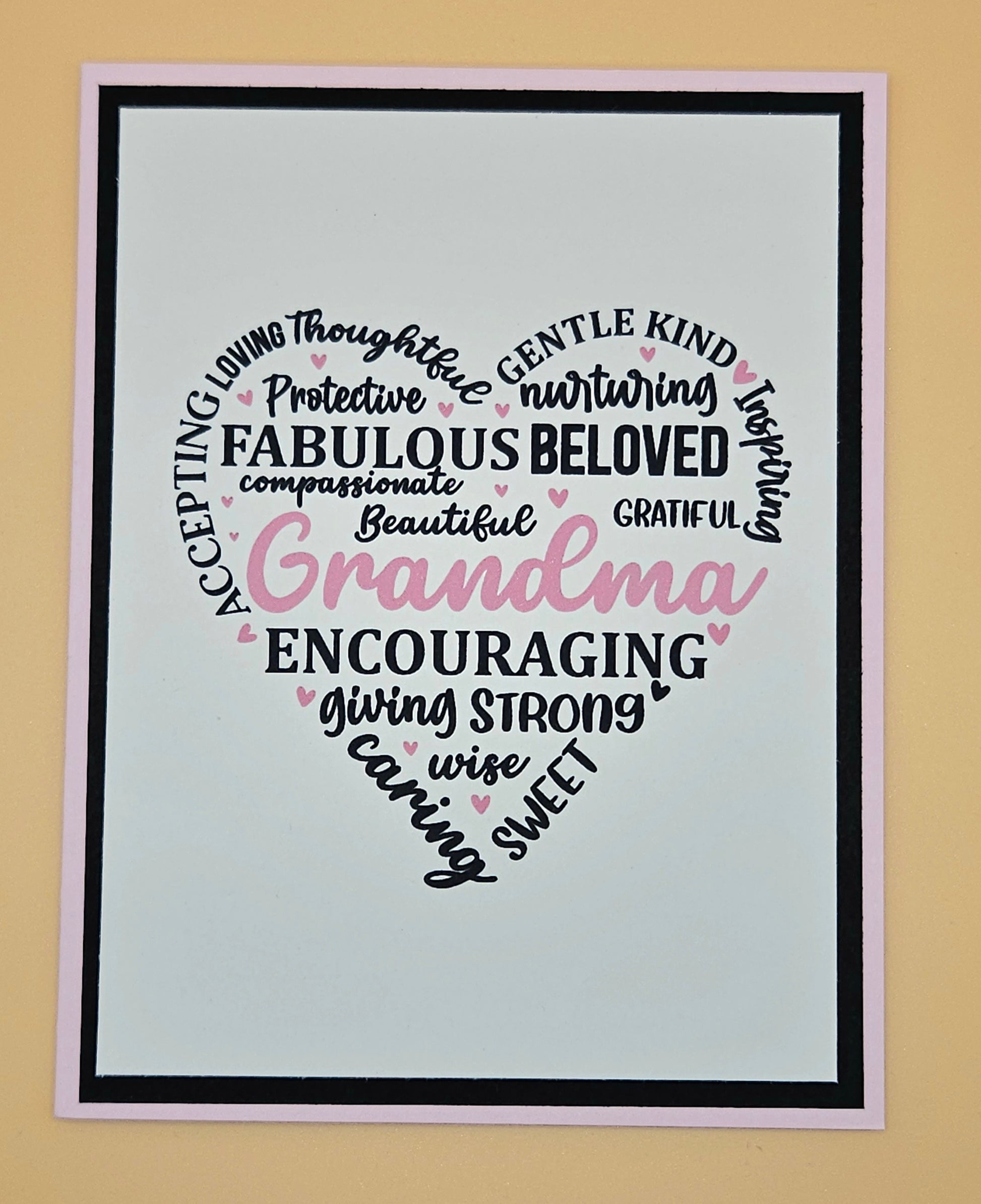 Handmade Mother's Day Greeting Card featuring a striking heart-shaped word cloud composed of admiring attributes like "Beloved," "Nurturing," and "Strong" centered around a pink script "Grandma". The sophisticated design is accented by tiny pink hearts and layered with a bold black frame and a soft pink outer border.